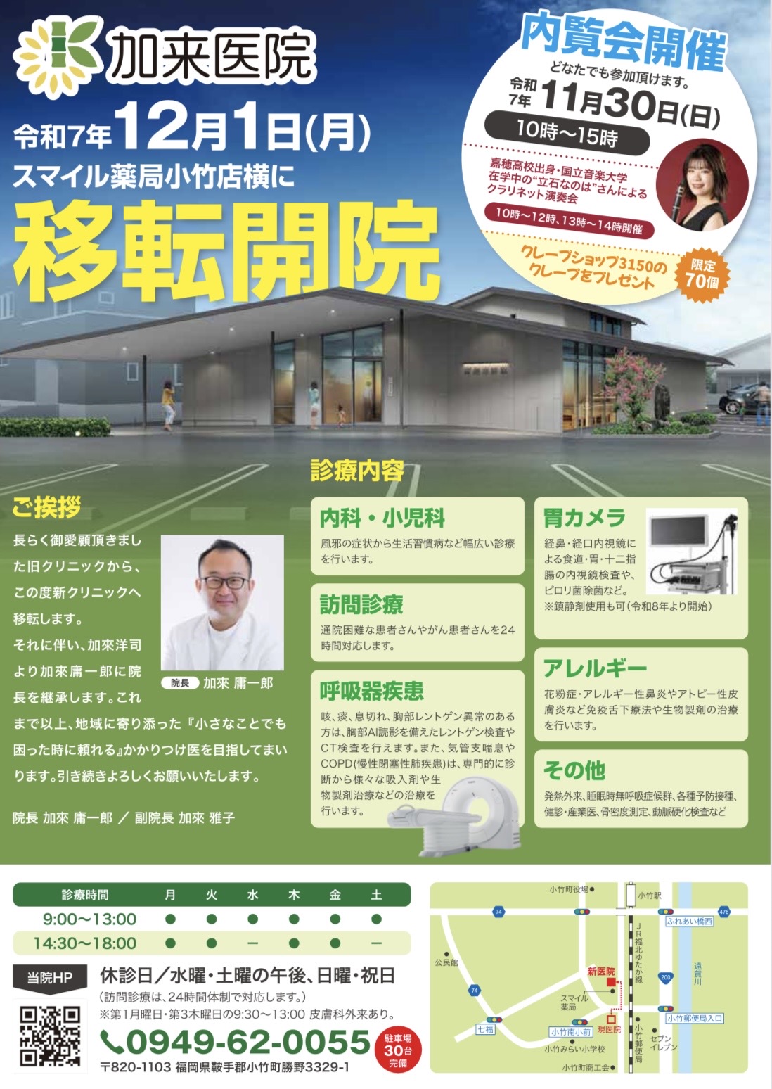 現在、加来医院第2駐車場〒820-1103 福岡県鞍手郡小竹町勝野3329番地1(スマイル薬局小竹店 隣)にクリニック建設中です。
